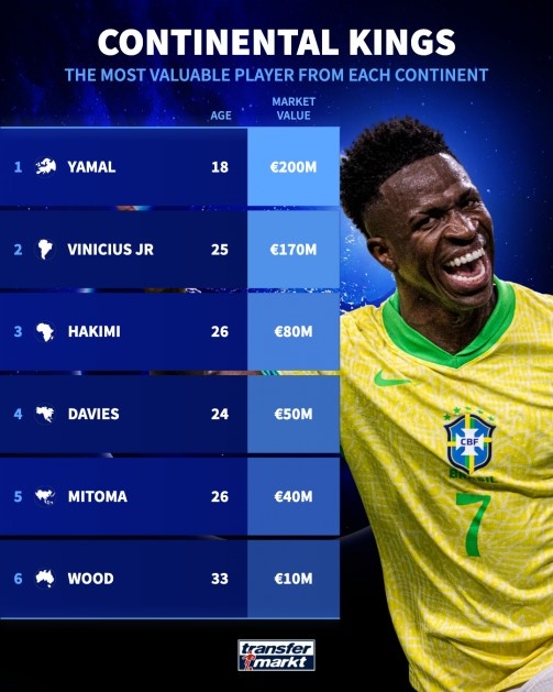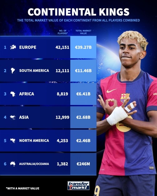 8月23日讯 德国转会市场列出了各大洲身价最高的球员,以及各大洲的球员总身价。