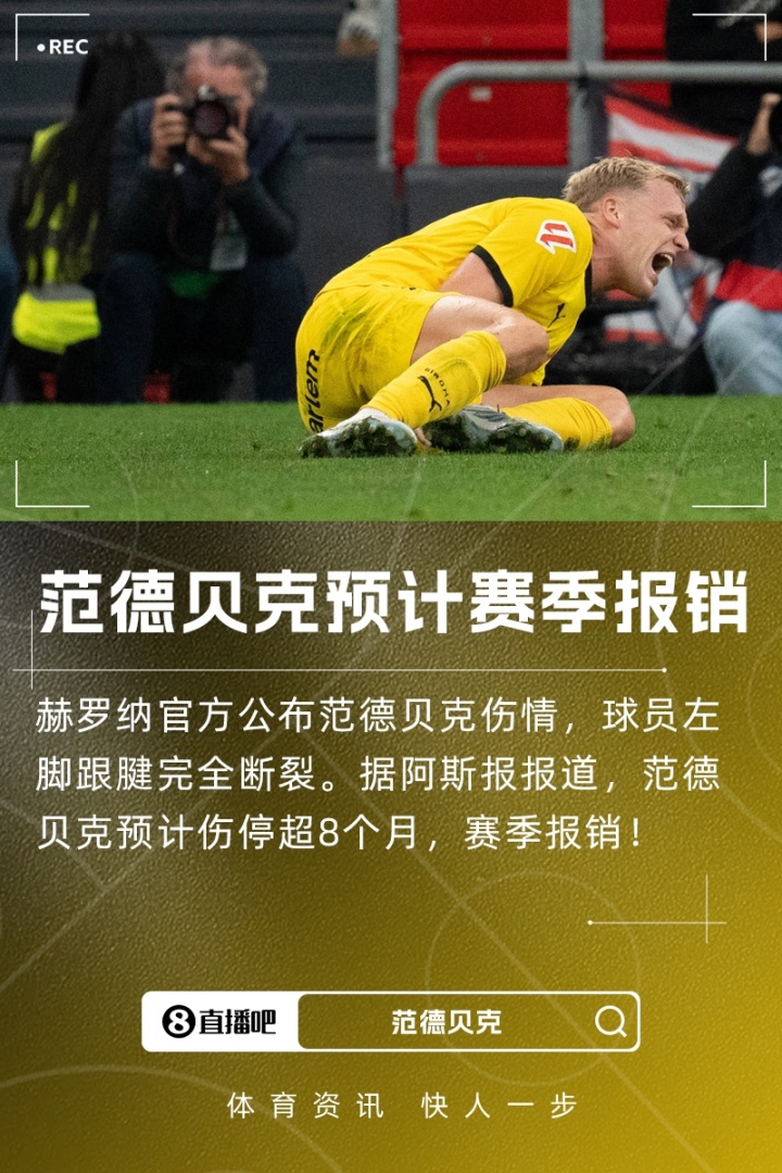 9月26日讯 赫罗纳官方宣布范德贝克伤情,范德贝克左脚跟腱完全断裂.《阿斯报》报道,赫罗纳中场范德贝克预计将伤停超8个月,本赛季报销。