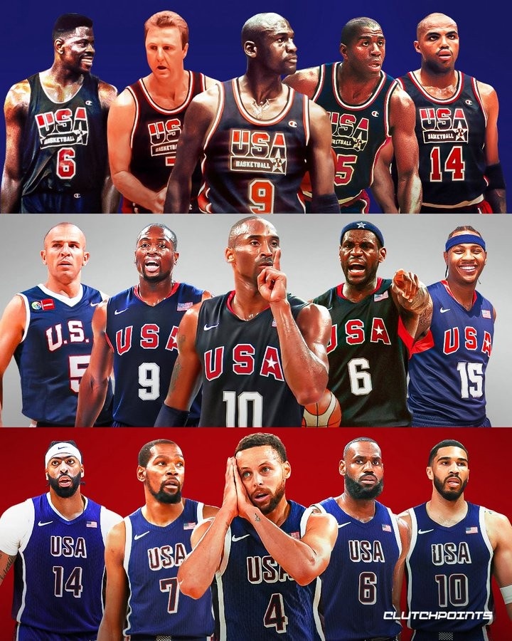 美媒clutchpoints晒出梦一队、梦八队和此前在巴黎夺冠的最新梦之队对比,并写道: