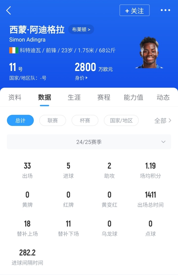 阿迪格拉,现年23岁,科特迪瓦前锋,上赛季代表布莱顿出战33场比赛,贡献5球2助,球员德转身价2800万欧。
